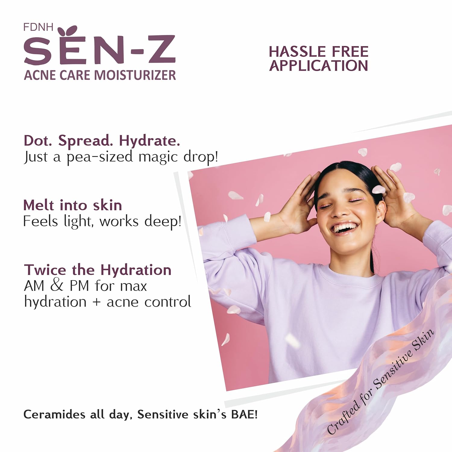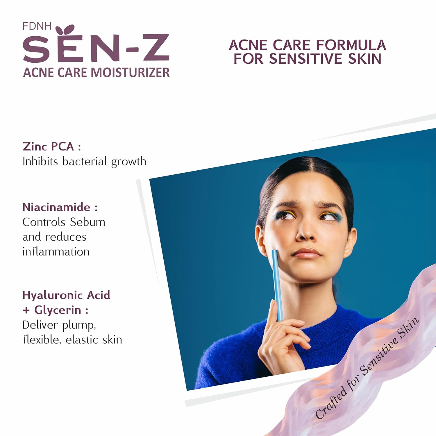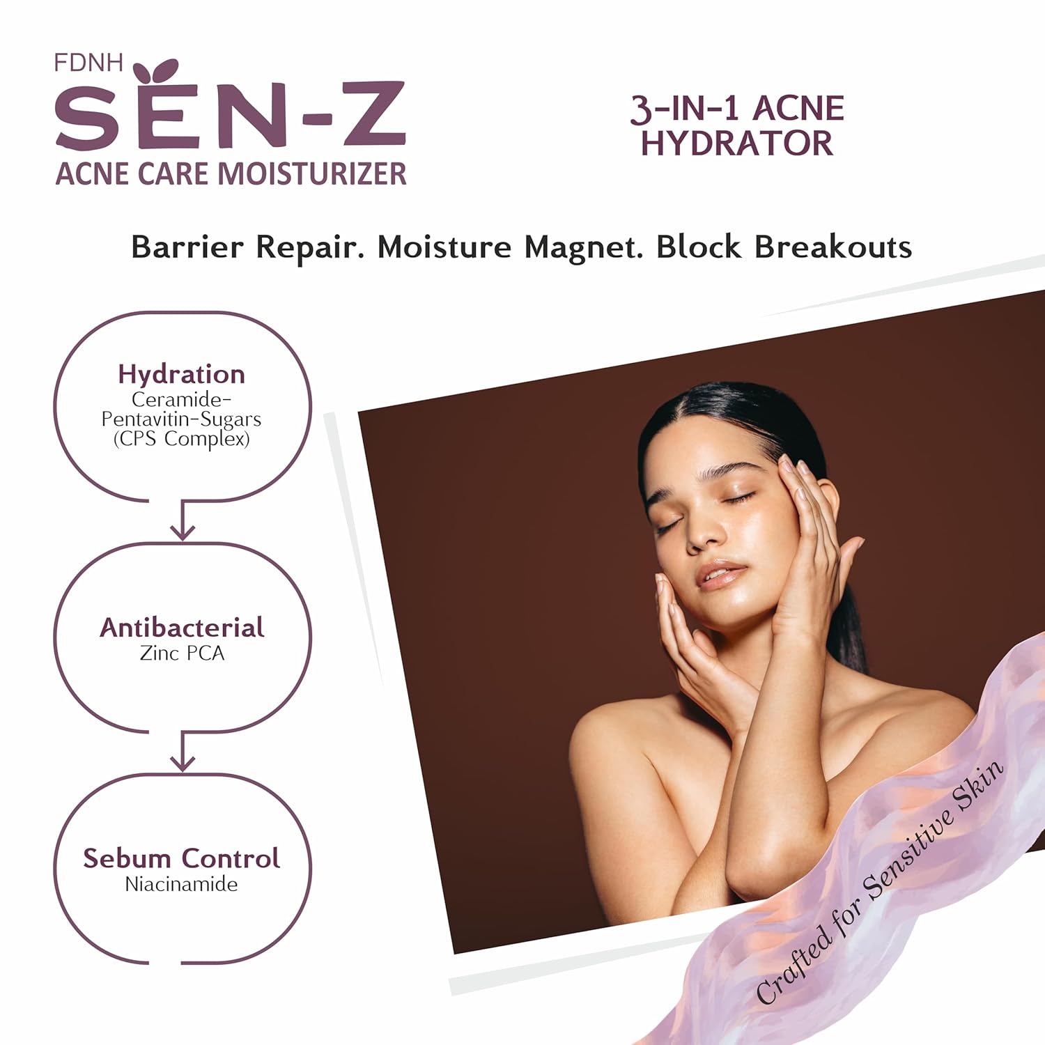 FDNH SEN-Z Acne Care Moisturizer | For Sensitive, Acne-Prone Skin | Lightweight, Oil-Free, Non-Sticky | 5 Ceramides, Niacinamide, Hyaluronic, Pentavitin | 72H Hydration & Barrier Repair | Fast-Absorbing| 50g